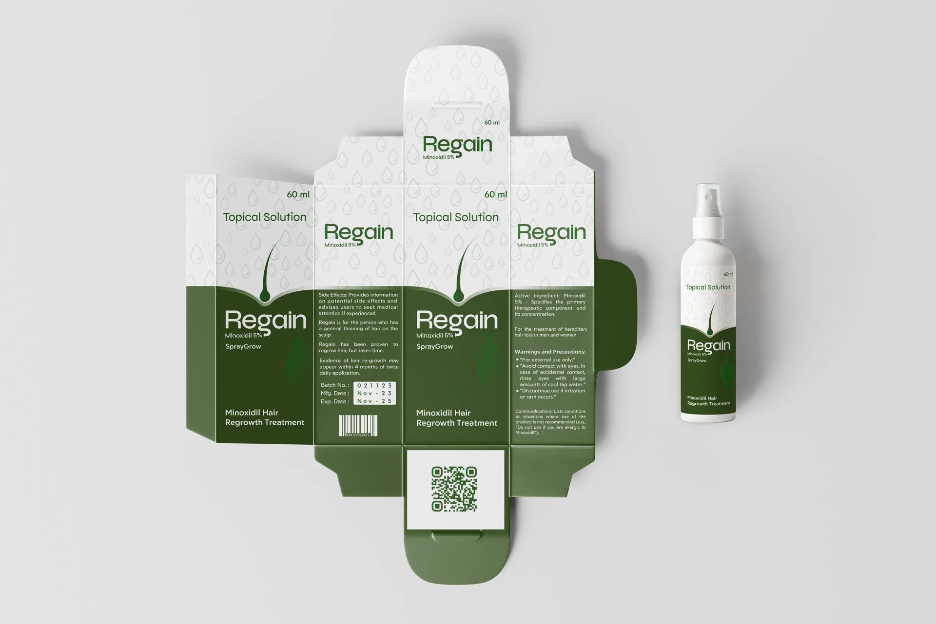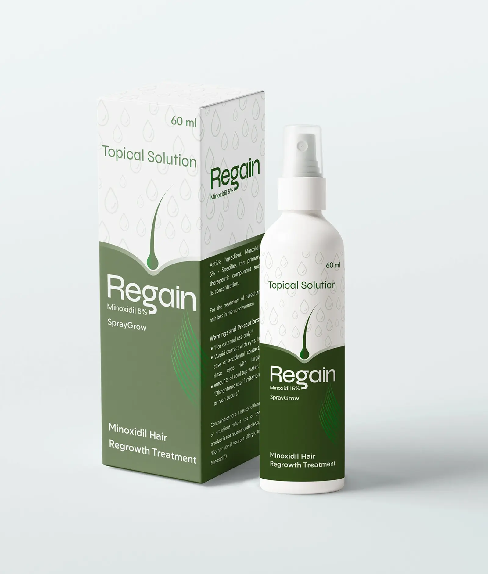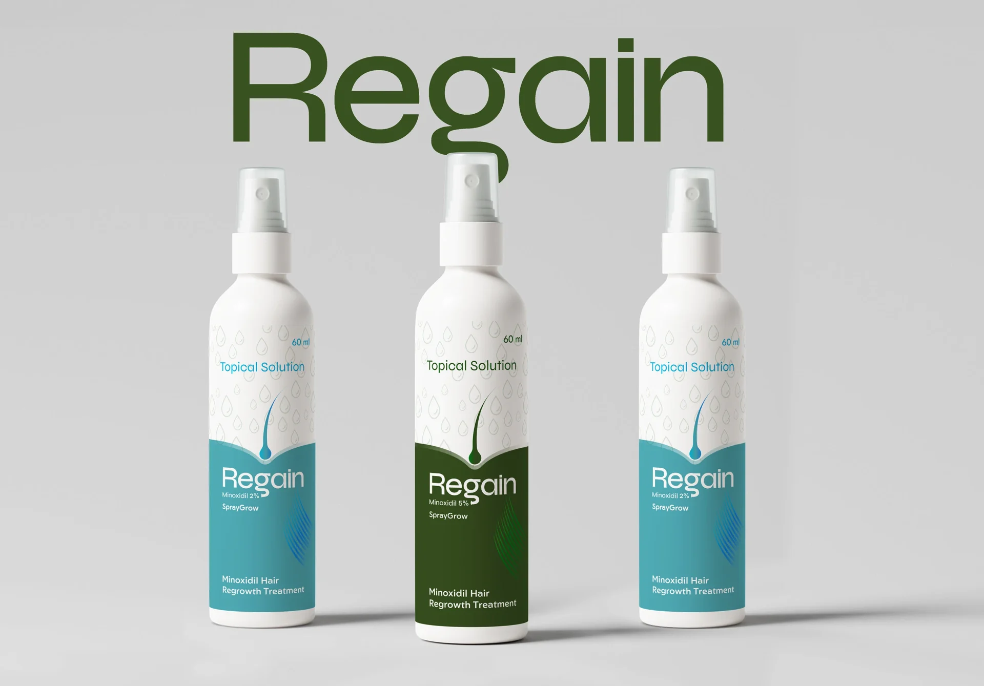Creating a complete and cohesive brand for Regain, covering the logo, brand identity, color palette, packaging, and social media visuals, with the goal of translating a clinically driven hair regrowth product into a modern, trustworthy, and recognizable brand that communicates credibility, clarity, and long-term value across both physical and digital touchpoints.